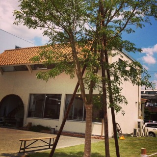 お店の駐車場の半分に芝をはってもらいました!シンボルツリーは「シマトネリコ」です!